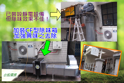 小松環保於台北市中山區的FARAMITA,完成裝設一式餐飲業油煙異味處理設備,由於店家原本之靜電除油設備除味效果不佳,因此加裝本公司CF型除味箱