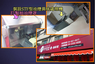 小松環保於彰化市北斗鎮中華路上咖啡家咖啡+飲食+茶飲,完成裝設一式餐飲業油煙異味處理設備,包括STF油煙處理機一台、1/2HP風機、訂製抽油煙罩一只,安裝後