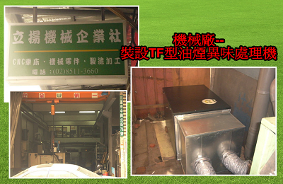 小松環保於新北市三重區的立揚機械,完成裝設一式TF型油煙/異味處理設備,為店家解決了C N C車床工作產生大量出煙的問題,本設備沒有機械裝置,去除油煙效率穩定且不易故障,安裝後